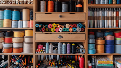 Fototapeta premium Tidy craft area with organized supplies and color-coded thread spools