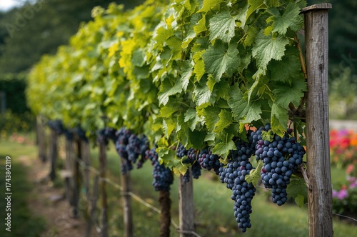 © AkuAku, Fototapeta premium Tidy vine of grapes growing on a garden trellis