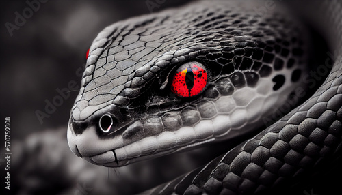 © Sarah, Fototapeta premium Tier Color-Key-Effekt: Schwarz-weiß Foto von einer Schlange mit roten Augen - Generative Ai