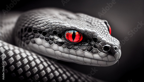 © Sarah, Fototapeta premium Tier Color-Key-Effekt: Schwarz-weiß Foto von einer Schlange mit roten Augen - Generative Ai