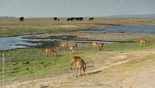© Manok, Fototapeta premium tierreiche Landschaft mit Impala Antilopen und Elefanten am Chobe River, Chobe Nationalpark, Botswana