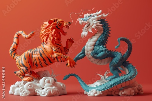© Phuriphat, Obraz premium tiger and a dragon are fighting in the water