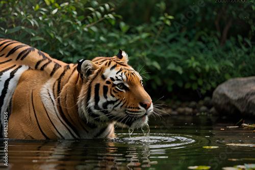 © Yuiziee, Naklejka premium Tiger Drinking from a Pond: A close-up of a tiger drinking water from a small pond in its zoo habitat, with lush greenery and reflections in the water