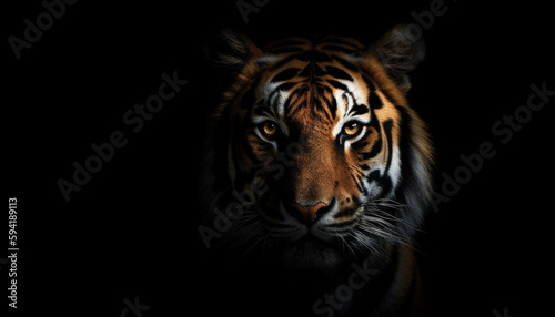 © Vishwajeet, Obraz premium Tiger face on black background, generative ai
