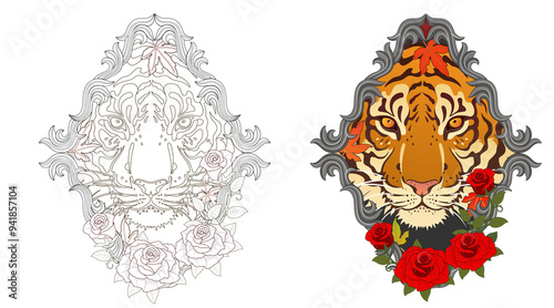 © pil, Fototapeta premium Tiger face tattoo design, Japanese style irezumi tattoo concept. Line artwork included 건대타투 타투달 호랑이 문신도안