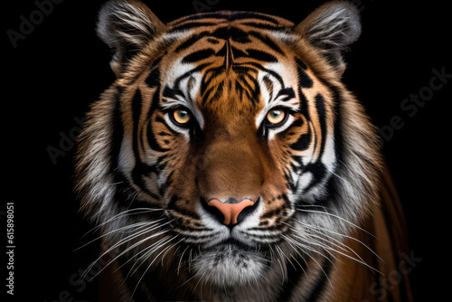 © Giovanna, Fototapeta premium tiger, front view, black background, hyperrealistic photography, ai generated.