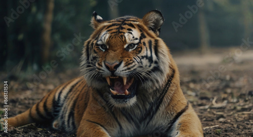 © nontekon, Fototapeta premium Tiger has an angry expression. He shows his fangs and gets angry while lying in nature. imitation of analog photography
