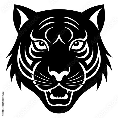 © Arnob, Obraz premium tiger head black silhouette vector, Simple silhouette Design vector icon with white background.
