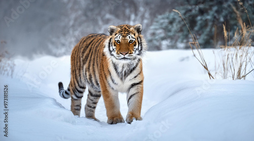 © Darcos, Obraz premium Tiger in wild winter nature. Amur tiger in the snow. Cold winter in tajga