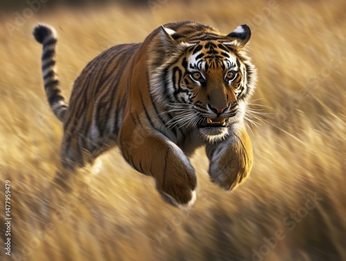 Naklejka premium Tiger leaping through grassy field