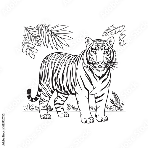 Naklejka premium Tiger Line Art Illustration with Jungle Leaves