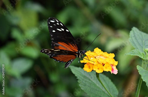Obraz premium Tiger Longwing (Heliconius Hecale) or Golden Helicon butterfly on yellow flower