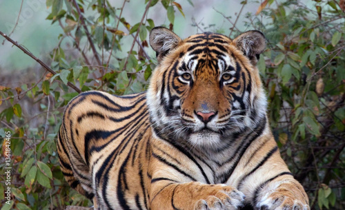 © tonymills, Fototapeta premium Tiger (Panthera tigris) portrait of a male, sat down, looking at the camera, looking at me, Ranthambhore National Park, Rajasthan, India.