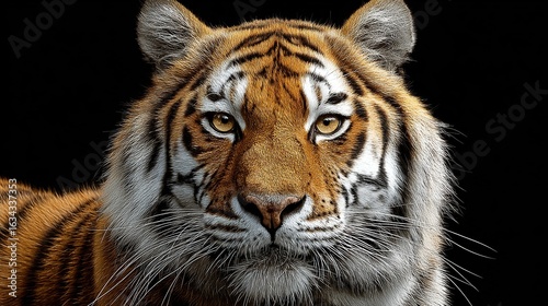 Fototapeta premium Tiger portrait direct stare, orange & black stripes, dark background fills...