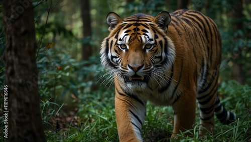 Naklejka premium Tiger prowling in a dense forest.