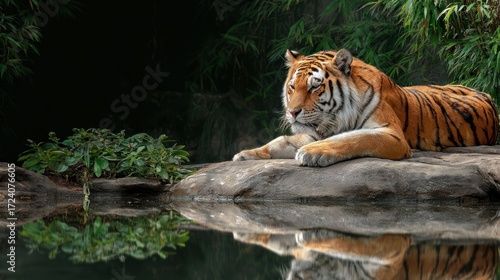 © tia, Obraz premium Tiger resting on rock over water