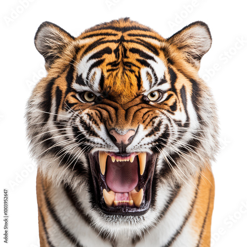 © tanapat, Naklejka premium Tiger roaring fiercely, showcasing powerful features and vibrant fur. transparent background