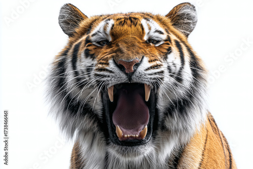 Obraz premium Tiger roaring with teeth bared against white backdrop