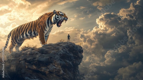 © lasalus, Fototapeta premium Tiger roars at sunset cliffs