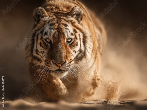 Naklejka premium Tiger runs swiftly through dusty terrain in a dramatic display of agility and...