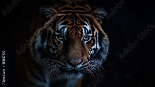 © nikomsolftwaer, Naklejka premium Tiger's sharp eyes glowing in the dark jungle night wildlife photography mysterious environment close-up alertness and beauty