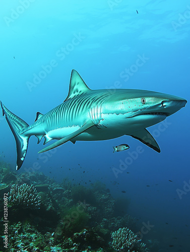 Fototapeta premium Tiger shark swimming over vibrant coral reef.