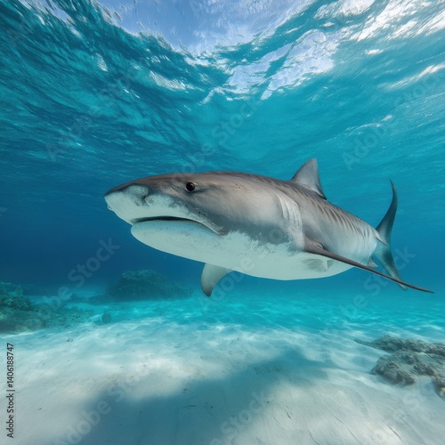 Naklejka premium Tiger shark swimming symmetrically with natural lighting and balanced...