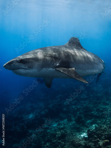Obraz premium Tiger shark underwater in blue ocean. Huge shark close up