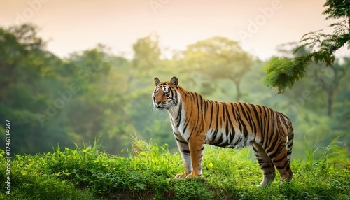 © netsay, Naklejka premium Tiger Standing Majestically on a Green Forested Hilltop at Dusk A Captivating Wildlife Moment in the Heart of a Vibrant Forest