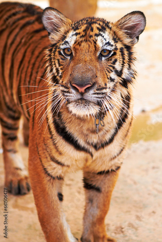 Fototapeta premium Tiger standing on sand in nature by a zoo for majestic entertainment at a...