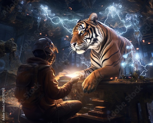 © Nipon, Fototapeta premium Tiger Virtual reality archaeo-anthropologist exploring digital societies