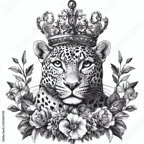 Fototapeta premium Tiger with crown and floral wreath in engraving or woodcut style