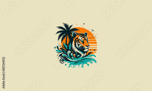 © dewa, Obraz premium tiger with palm on beach vector logo design