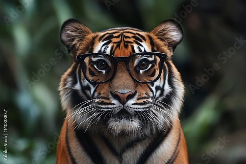 © Irina, Fototapeta premium Tiger with sharp black glasses showing personality in a lush green environment