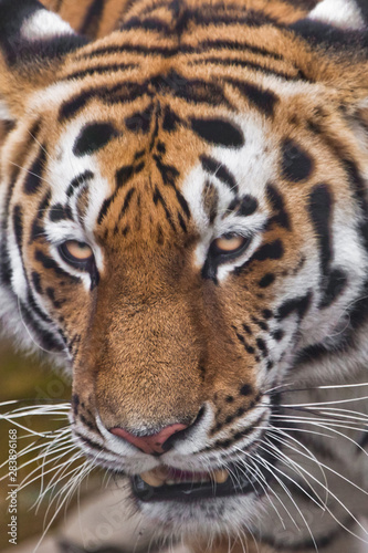 © Mikhail Semenov, Obraz premium Tigerclose-up huge red muzzle of a predatory beast with an attentive gaze of cat's eyes.