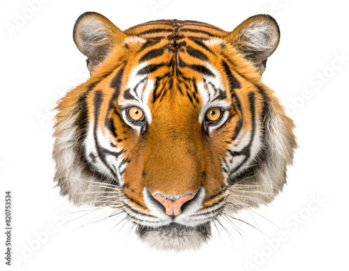 Fototapeta premium Tigerkopf isoliert auf weißen Hintergrund, Freisteller, draufsicht