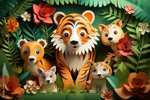 Naklejka premium Tigers and wild animals in the forest from paper cut out effect in bright tone