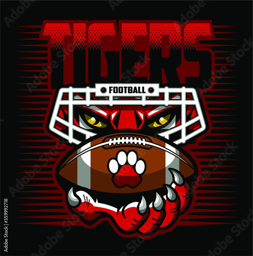 Naklejka premium tigers football team design with mascot, facemask and ball for school,...