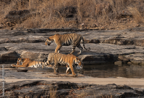 © Dr Ajay Kumar Singh, Fototapeta premium Tigress and three cubs in and near water body at Panna Tiger Reserve, Madhya pradesh, India