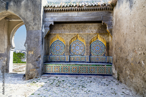 Fototapeta premium Tiled and carved alcove in Casbah, Tangier with distant skyline