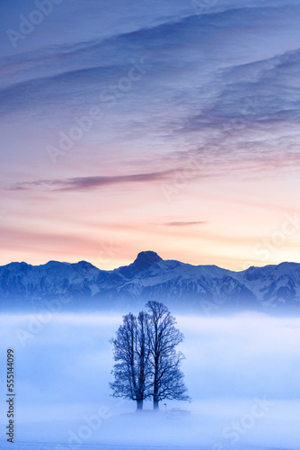 © schame87, Fototapeta premium tilia tree standing in mist during blue hour in winter on Ballenbühl in Emmental