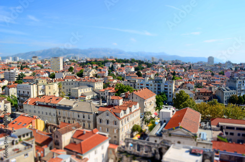 Obraz premium Tilt-shift panoramic view of Split old town with red rooftops and Adriatic architecture from church tower