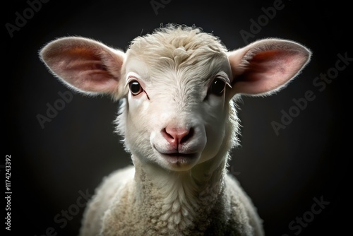 © StudioATC, Fototapeta premium Tilt-shift photography captures a tiny lamb against a stark black background. A precious baby animal portrait.