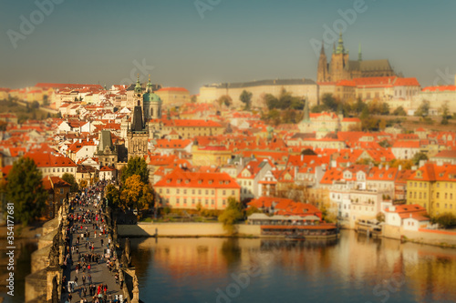 Fototapeta premium Tilt Shift Photography View of Charles Bridge and Prague Castle. Aerial view of the rooftops of Prague.