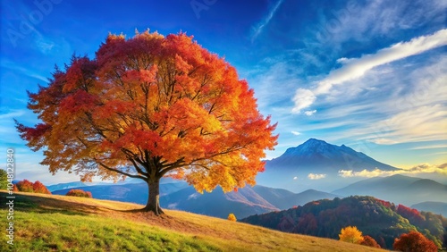 Fototapeta premium Tilted angle colorful tree against blue sky and mountains in autumn