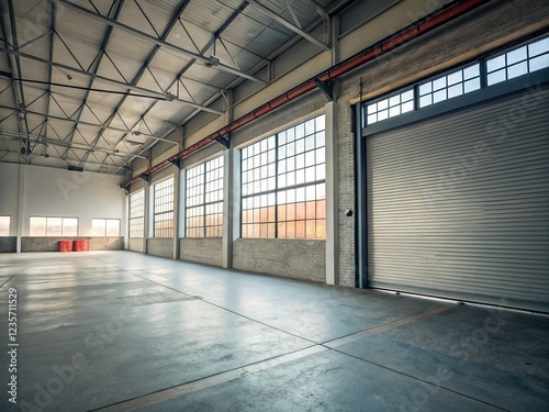 © Adisorn, Obraz premium Tilted warehouse door, empty, a miniature landscape.