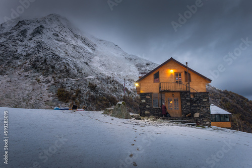Fototapeta premium Timber cottage in the snowy day with a snow mountain background during twilight time