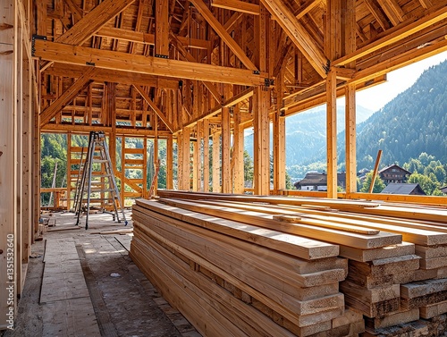 Fototapeta premium Timber frame construction site with interlocked beams, skeletal structure in progress, ladders and tools scattered, raw wood stacks await next build phase.