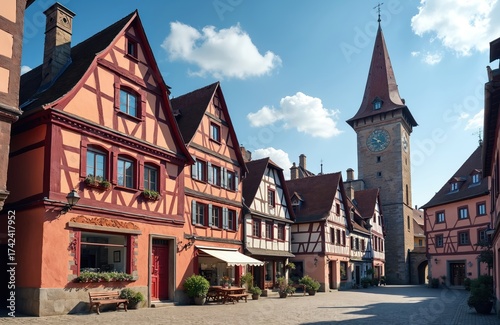 © Pete, Fototapeta premium Timber framed houses line a cobblestone square. A tall clock tower with red roof dominates the picturesque German old town cityscape. Sunny day, blue sky, clouds.