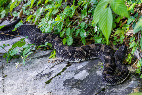 Obraz premium timber rattlesnake crotalus horridus black and chocolate phase black head...